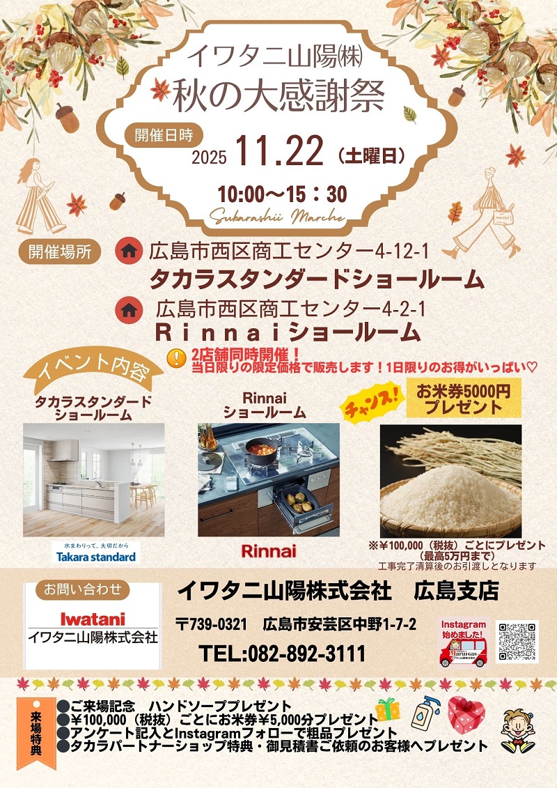 開催日 : 11月22日(土) 【秋の大感謝祭】 (会場:タカラスタンダードショールーム / Rinnnaiショールーム) 2025/11/6