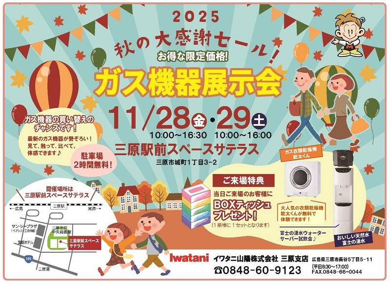 開催日 : 11月28~29日(金・土) 【秋の大感謝祭セール ガス機器展示会】 (会場:三原駅前スペースサテラス) 2025/11/6